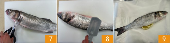 Agora limpe o peixe cortando as barbatanas 7, escame-o com a ferramenta apropriada 8. Depois de eviscerá-lo e enxaguá-lo em água corrente tanto por dentro quanto por fora, recheie o interior com as fatias de limão 9.