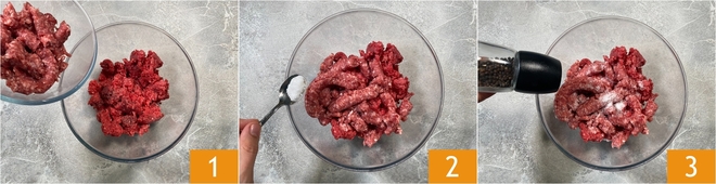 Para preparar o rocambole na frigideira, misture em uma tigela a carne moída de boi e a linguiça 1, depois tempere com sal 2 e pimenta 3.