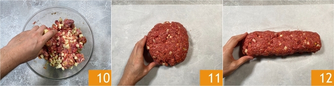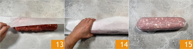 Continue amassando com as mãos na tigela até obter uma mistura homogênea 10; esta etapa é fundamental para um bom resultado durante o cozimento 11. Coloque a massa sobre uma folha de papel manteiga 11 e forme um rocambole um pouco mais curto que o diâmetro da sua frigideira 12.