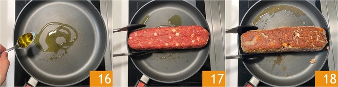 Depois do tempo de firmeza, aqueça o óleo em uma frigideira grande 16, depois coloque cuidadosamente o rocambole e deixe dourar de um lado sem nunca mexer 17. Com a ajuda de uma pinça, vire o rocambole para dourar também do outro lado 18; levará de 12 a 18 minutos no total.