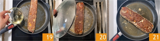 Neste ponto, adicione o vinho branco 19 e deixe evaporar completamente o cheiro de álcool, depois cubra com a tampa 20. Cozinhe em fogo médio-baixo por mais 12 minutos. Seu rocambole na frigideira está pronto para ser servido junto com seu delicioso molho de cozimento 21!