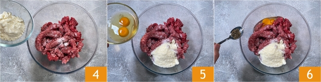 Agora adicione também o Parmigiano Reggiano ralado 4, os ovos 5 e a salsinha seca 6.