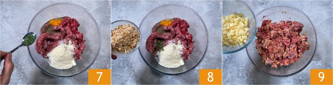 Aromatize também com a cebolinha seca 7 e por último adicione a farinha de rosca rústica 8. Misture com as mãos para integrar os ingredientes, depois adicione o queijo gruyère cortado em cubos 9.