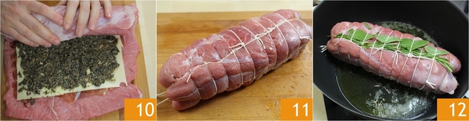 Enrole a carne 10 e amarre o rocambole com barbante de cozinha 11, como se fosse um assado, seguindo as instruções que Como amarrar o assado (Amarrar um assado). Insira as folhas de sálvia e alecrim sob o barbante ao longo de todo o comprimento do rocambole e coloque-o em uma panela de borda alta, onde você já aquecida 4 colheres de sopa de óleo, e deixe cozinhar de todos os lados para selar bem todas as extremidades do rolo 12.