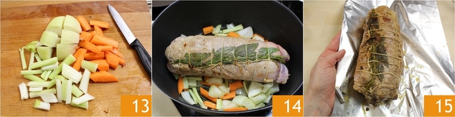 Fatie em pedaços grandes a cebola, o aipo e a cenoura 13 e adicione-os na panela junto com o rocambole 14. Salgue e apimente a carne e deixe cozinhar por 40 minutos com uma tampa com uma abertura. Durante o cozimento, regue o rocambole com a cerveja sempre que começar a secar muito. Após 40 minutos, verifique se a carne está cozida com a ajuda de um palito: perfurando a superfície do rocambole, deve sair um líquido claro. Se o líquido for rosa, a carne deve cozinhar um pouco mais. Após o cozimento, coloque o rocambole em uma folha de papel alumínio 15 e feche-o, para que os sucos da carne se redistribuam.