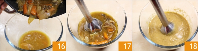 Enquanto isso, transfira o fundo de cozimento com os legumes para uma tigela 16 e bata-os com um liquidificador de imersão 17 para obter um molho saboroso, que acompanhará a carne 18. Corte a carne em fatias de meio centímetro, regue com o molho e sirva seu rocambole de cerveja com speck e cogumelos!