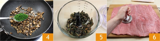 Por fim, adicione uma colher de sopa de salsinha picada 4, sal e pimenta e deixe cozinhar por mais 3-4 minutos. Transfira tudo para um mixer 5 e bata para obter um creme grosso e não muito fino. Estenda a alcatra de vitela sobre uma superfície de trabalho e aplaine-a com um martelo de carne 6.