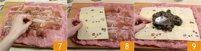 Agora comece a recheá-la: primeiro cubra com as fatias de speck 7, depois continue com as fatias de Emmental 8 e, por fim, espalhe o creme de cogumelos morno 9.