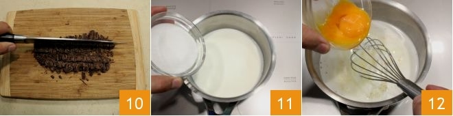 Pique finamente o chocolate amargo 10, depois despeje o leite em uma panela junto com o açúcar 11. Aqueça e assim que ferver, retire do fogo e adicione as gemas, mexendo com um batedor para quebrá-las 12. Recoloque no fogo por alguns minutos e assim que ferver novamente, desligue