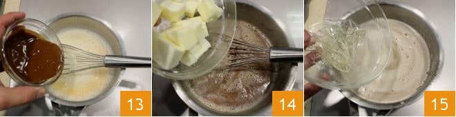 em seguida, adicione o creme de avelãs 13 e a manteiga em pedaços 14. Deixe esfriar por alguns minutos, então adicione as folhas de gelatina previamente escorridas e bem espremidas 15; derreta completamente mexendo sempre com o batedor.