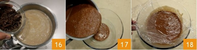 Logo após, adicione também o chocolate picado anteriormente 16 e derreta completamente mexendo. Despeje a mistura obtida em uma tigela 17 e cubra com filme plástico em contato direto 18. Deixe esfriar à temperatura ambiente por pelo menos 30 minutos, depois uma hora na geladeira.