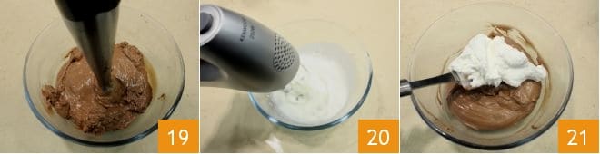 Passado o tempo necessário, retome o creme de avelãs e com um mixer de imersão, bata para alisar a mistura 19; bata o creme de leite fresco em uma tigela com batedores bem frios 20, então adicione ao creme de avelãs mexendo com uma espátula macia de cima para baixo para não desmanchar 21: o seu recheio está pronto.