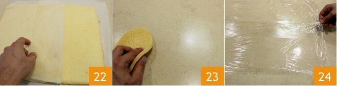 Quando a massa do biscoito estiver fria, remova o pano de prato e a camada de papel manteiga 22, depois passe um pano úmido na superfície de trabalho 23 e estenda duas folhas de filme plástico mais longas que a massa do biscoito por 5-6 cm, ligeiramente sobrepostas 24