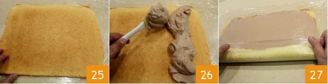 vire a massa do biscoito sobre o filme plástico e retire também a outra folha de papel manteiga: a parte escura da massa do biscoito deve estar voltada para cima 25; recheie a massa do biscoito com uma camada de creme de avelãs de 1 cm de espessura, deixando cerca de 1 cm da borda 26. Quando terminar, enrole a massa do biscoito ajudando-se com o filme plástico, começando pelo lado mais longo à sua frente 27. À medida que enrola, lembre-se de remover o excesso de filme nas bordas.