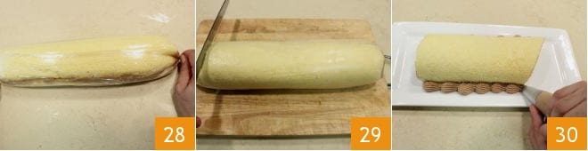 Depois de enrolar, torça o excesso de filme nas bordas 28 e, segurando firmemente as pontas, puxe com as mãos para fora ao mesmo tempo em que afasta o rocambole de você, fazendo-o "caminhar" na superfície de trabalho, de forma a apertá-lo como uma bala. Se formarem bolhas, fure o filme com uma faca 29: coloque na geladeira para firmar por pelo menos 40 minutos. Depois de resfriado, corte as duas extremidades com uma faca de lâmina lisa e coloque o rocambole em um prato de servir. Em seguida, coloque o creme de avelãs restante em um saco de confeitar e decore o rocambole em torno dos lados mais longos com pequenos montes 30