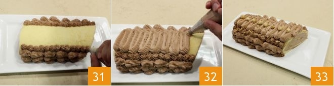 depois lateralmente e finalmente com outras decorações de creme na superfície (31-32); o seu rocambole de creme de avelãs está pronto para ser saboreado 33! Você pode decorá-lo a gosto com avelãs inteiras ou picadas ou com gotas de chocolate!