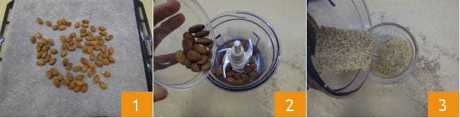Para preparar os roccocò, comece tostando as amêndoas com a casca. Para isso, basta colocá-las em uma assadeira e levá-las ao forno pré-aquecido a 180° por 5 minutos 1. Uma vez tostadas, retire-as do forno, deixe esfriar um pouco e em seguida coloque 50 gramas em um processador 2 e triture até obter uma consistência arenosa; reserve as restantes 3.