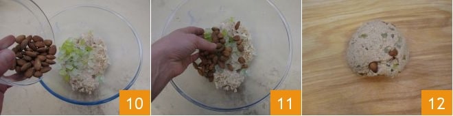 Adicione o cedro picado junto com 50 gramas de amêndoas inteiras 10, misture-os à massa e depois transfira tudo para a bancada 11. Continue amassando até obter um bloco liso 12.
