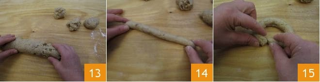 Trabalhe a massa com as mãos até obter um rolo 13 do qual você poderá retirar 11 pedaços de cerca de 75 gramas cada, simplesmente separando com as mãos, para preservar a integridade das amêndoas inteiras. Dos pedaços, faça cordões de cerca de 20 centímetros 14, depois una as duas extremidades 15 para formar uma rosquinha.