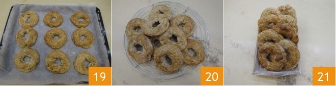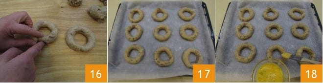 Pressione com os dedos as duas extremidades para selá-las, para que mantenham a forma durante o cozimento 16. Transfira as rosquinhas para uma assadeira forrada com papel manteiga 17 e pincele a superfície com ovo levemente batido 18. Se decidir adicionar os 30 gramas de amêndoas opcionais para decorar a superfície, pode fazê-lo agora, após pincelar as rosquinhas.