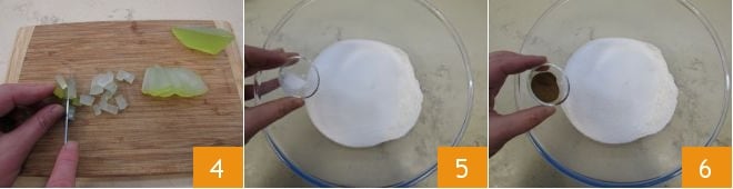 Corte o cedro cristalizado em cubos 4 e dedique-se à massa: em uma tigela, misture a farinha 00 com o açúcar e o bicarbonato (se desejar seguir a receita tradicional, use amônia alimentar em vez de bicarbonato, nas mesmas quantidades) 5, depois o mix de especiarias indicado (ou, conforme a receita tradicional, o pisto) 6.