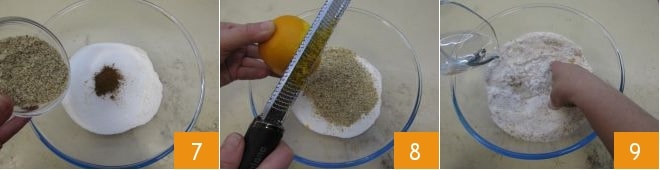 e as amêndoas trituradas 7. Rale a casca de ¼ de laranja 8 e misture adicionando a água em temperatura ambiente aos poucos 9 até obter uma massa muito compacta e seca.