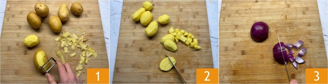 Para preparar o rolê de frango, comece pelo acompanhamento: descasque as batatas 1 e corte-as em pedaços de 1,5 cm 2. Faça o mesmo com a cebola roxa 3.