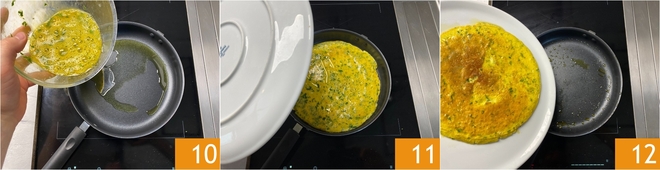 Despeje a mistura em uma frigideira antiaderente de cerca de 20-22 cm bem quente 10 e cozinhe por 3-4 minutos em fogo médio. Quando a superfície ficar um pouco mais firme, cubra a frigideira com um prato grande 11 e vire a omelete. Continue o cozimento do outro lado por 1-2 minutos 12.