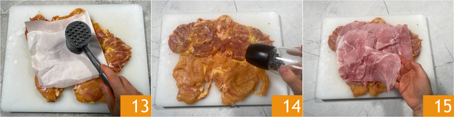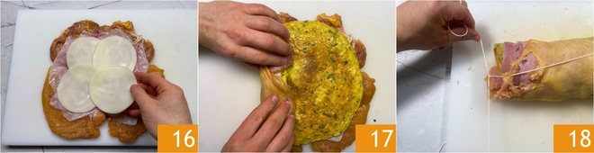 Enquanto deixa a omelete esfriar, ocupe-se do frango desossado: coloque-o sobre uma tábua com a pele voltada para baixo e bata cuidadosamente com um martelo de carne, ajudando-se com papel manteiga para não rasgar a carne 13. Quando o frango estiver fino, tempere com sal e pimenta 14. Recheie primeiro com as fatias de presunto cozido 15.