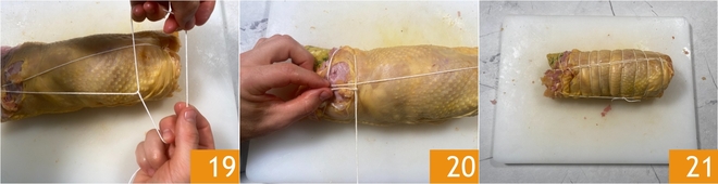 Dê 2 voltas em torno da mão para formar um pequeno nó e passe-o ao redor da carne 19 até chegar ao ponto em que você fixou o rolê 20. Repita este passo, espaçando as voltas de barbante a cada dois centímetros até envolver completamente o assado. Uma vez na outra extremidade, feche com outro nó 21.