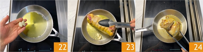 Passe à cocção do rolê: em uma frigideira de aço, aqueça o óleo com os dentes de alho 22 e doure o rolê do lado da pele 23. Deixe selar a carne por 1-2 minutos em fogo alto, tentando não movê-la. Somente quando a parte em contato mudar de cor, você poderá virar sem esforço, deixando dourar todos os lados 24.