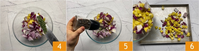 Junte batatas e cebola em uma tigela e tempere com salsa picada 4, óleo, sal e pimenta 5. Misture bem e distribua em uma assadeira, depois asse em forno ventilado a 200° por cerca de 20 minutos 6.