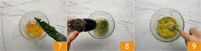 Enquanto isso, dedique-se à omelete: quebre os ovos em uma tigela, adicione salsa picada 7, sal e pimenta 8 e bata bem tudo 9.