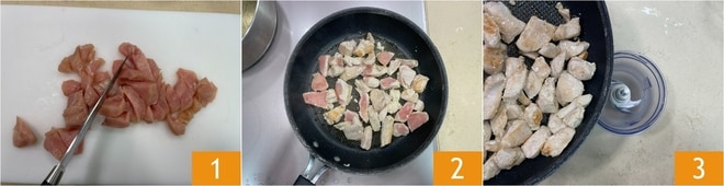 Para preparar os rolinhos de frango frito com molho e vegetais, primeiro corte o peito de frango em pedaços 1. Doure em uma frigideira antiaderente 2 por cerca de dez minutos, salgue e apimente. Cozinhe o frango até que esteja bem cozido, depois coloque os pedaços em um mixer 3.