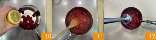 Enquanto isso, prepare os diversos molhos. Comece com o de framboesa. Coloque as framboesas em uma panela, adicione o suco de limão 10 e a água. Cozinhe em fogo médio por cerca de 5 minutos, mexendo sempre 11, até que se desfaçam. A este ponto, misture com um mixer de imersão 12.