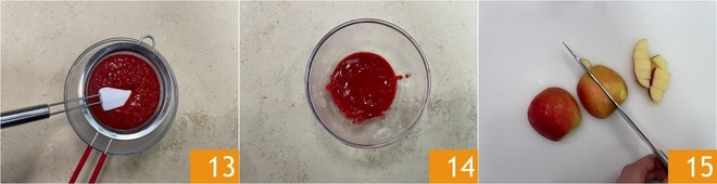 Coe o molho obtido com uma peneira 13, então reserve 14. Agora prepare o de maçã: lave-as, retire o miolo e corte-as em cubos 15.