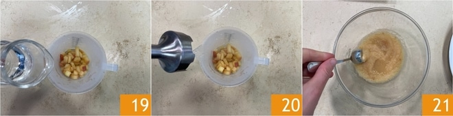 Adicione a água restante 19 e misture as maçãs 20. Você deve obter uma consistência cremosa 21; reserve.