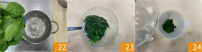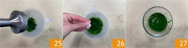 Branqueie os espinafres em água salgada 22 por alguns segundos. Escorra-os e transfira-os para água com gelo 23. Escorra novamente, transfira para um recipiente alto e estreito e adicione a água 24.