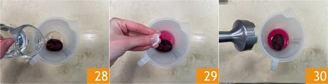Prepare o último molho. Coloque a beterraba em um recipiente alto e estreito, adicione a água 28, o sal 29 e misture com um mixer de imersão 30. Reserve também este.