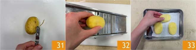 Passe para as batatas. Descasque-as 31 e lave-as. Corte-as finamente com um mandolim, de modo a obter uma espessura de poucos milímetros 32. Faça 4 torres de 10 fatias cada e coloque-as em uma assadeira forrada com papel manteiga 33.