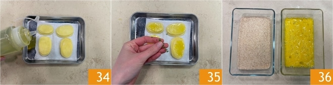 Tempere com sal, óleo 34 e tomilho 35. Asse em forno pré-aquecido a 200°C por 30 minutos. Enquanto isso, prepare os ingredientes para empanar os rolinhos de frango. Coloque em uma tigela a farinha de rosca e em outra os ovos batidos 36. Quando faltarem poucos minutos para as batatas ficarem prontas, comece a aquecer o óleo, que deve atingir uma temperatura de 170-180°C.