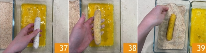 Enquanto o óleo esquenta, empane os rolinhos. Passe-os primeiro no ovo 37, depois na farinha de rosca, novamente no ovo e por último novamente na farinha de rosca 39; de modo a fazer uma dupla panagem.