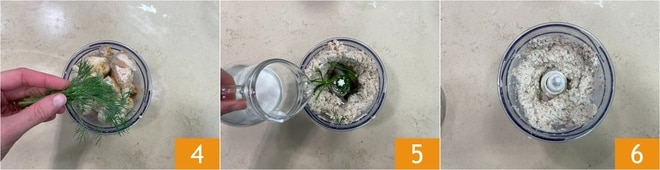 Adicione o endro e misture bem, depois junte o creme de leite 5 e continue a misturar até obter uma mistura cremosa e homogênea 6.