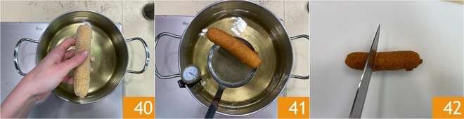 Assim que o óleo atingir a temperatura certa, mergulhe o primeiro cilindro de frango 40. Frite até que esteja bem dourado; depois escorra 41 em um papel toalha. Corte cada cilindro em 3 rolinhos 42.