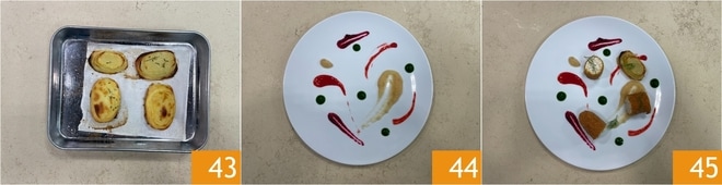 Retire também as batatas já cozidas do forno 43, depois monte o prato. Use os molhos de frutas e vegetais para decorar o prato 44, depois posicione por cima os rolinhos de frango e decore com raminhos de endro 45.