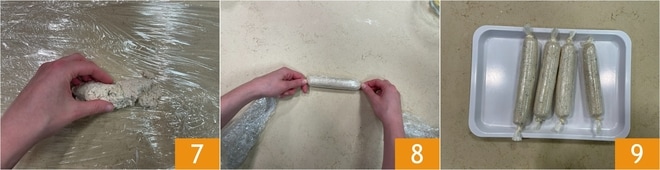 Com a ajuda de filme plástico, forme cilindros enrolando cerca de 100 g de mistura em cada um 7, aperte bem, faça o nó em ambos os lados 8, coloque em uma bandeja 9 e leve ao freezer por pelo menos 1 hora (este procedimento ajudará a tornar a mistura mais sólida para empanar sem dificuldade).