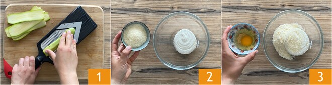 Para preparar os rolinhos de abobrinha ao molho, primeiro lave e corte as extremidades das abobrinhas. Fatie as abobrinhas com uma mandolina obtendo fatias finas, com espessura máxima de 2-3 mm 1. Prepare o recheio: em uma tigela misture a ricota (escorrida, se estiver muito aquosa) e adicione o parmesão 2, o ovo 3, sal e pimenta.