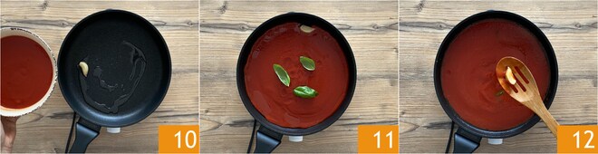 Adicione o purê de tomate 10, o manjericão 11 e o sal. Cozinhe por 10 minutos em fogo médio, com a tampa. Agora, retire o alho 12.
