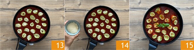 Abaixe o fogo e adicione os rolinhos de abobrinha 13. Polvilhe com parmesão ralado 14 e cozinhe por 15 minutos em fogo baixo com a tampa. Nos últimos 2-3 minutos, retire a tampa e deixe o molho engrossar. Sirva os rolinhos de abobrinha ao molho quentes 15.