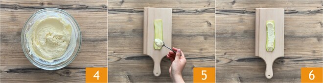 Misture com uma colher para integrar os ingredientes 4. Coloque uma fatia de abobrinha sobre uma tábua, com uma colher de chá adicione o recheio em uma das extremidades 5 e espalhe com o dorso ao longo de toda a fatia 6.